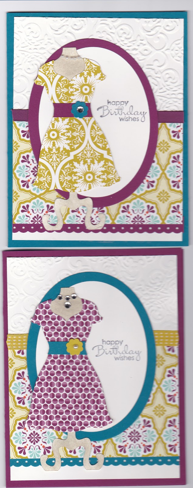 I recently got the Dress up framelits die, I decided to make a couple of cards with it. The bottom card I cased from someone but don't remember who or where, sorry. The top card is the same but I changed up the colors. I am planning on making one of these cards in my next class in May with my Clearly Contagious group. I haven't decided which color combo I like better. Girls from the group or any one? Let me know which one you would like to make or what color combo you like better?